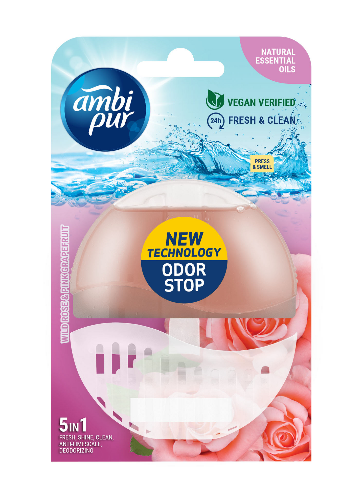 WC závěs AMBI PUR Šípková růže a růžový grapefruit jsou koncentrovaným tekutým čisticím prostředkem, který pomáhá předcházet usazování vodního kamene. Mušle se čistí při každém spláchnutí. Zanechává toaletu svěží, lesklou, čistou a voňavou.