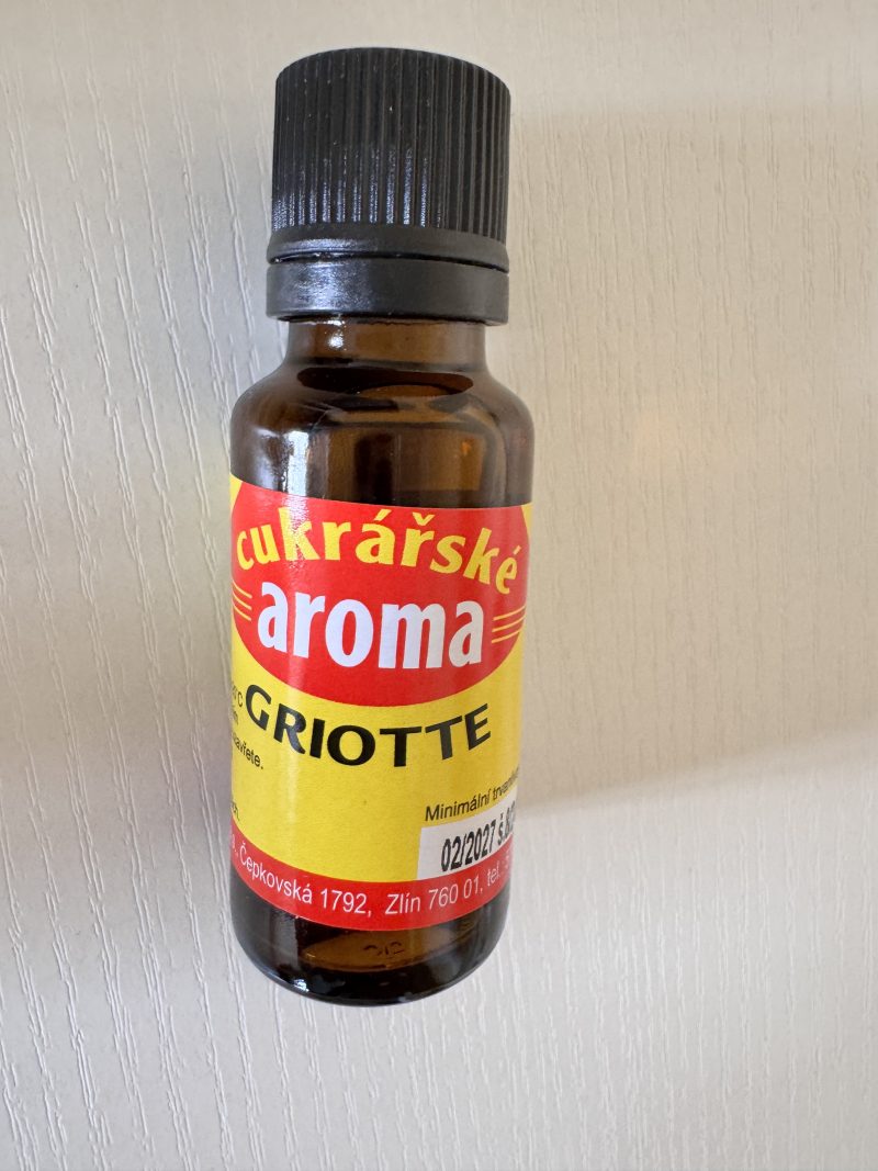 Tekuté potravinářské aroma s charakteristickou, sladkokyselou chutí a vůní griotek (višní typu griotte). Je určeno k ochucování cukrářských výrobků, jako jsou těsta, krémy, polevy, dorty, cukrovinky, zmrzliny nebo nápoje, včetně koktejlů, likérů a domácího punče. Dodává pokrmům a nápojům výraznou višňovou příchuť s jemným kyselým podtónem, ideální pro ovocné dezerty nebo nápoje. Aroma je vyrobeno na bázi lihu a vody, neobsahuje geneticky modifikované suroviny.