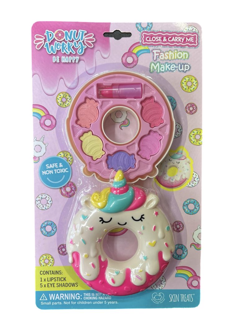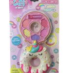 Kazeta make up set Jednorožec a Donat – Sada obsahuje 1 rtěnku a 5 očních stínů. Sada má tvar koblihy s růžovou polevou a dekorem jednorožce a malou duhou.