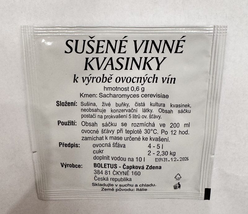 Obsah sáčku stačí na prokvašení 10ti litrů. Suché kvasinky se před vlastním kvašením vína nechají rozmnožit.