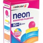 Náplast k ošetření malých ran a škrábanců. Flexibilní a prodyšné, voděodolné neonové barvy, 80 kusů, 4 velikosti.