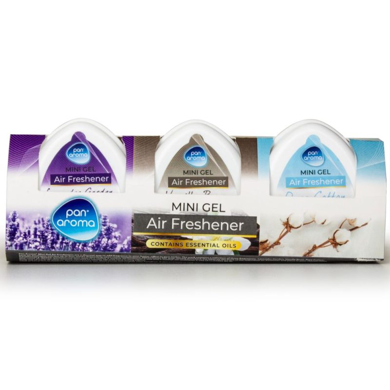 Sada tří gelových osvěžovačů vzduchu od značky Pan Aroma, obsahující vůně Fresh Linen (čisté prádlo), Lavender (levandule) a Vanilla & Coconut (vanilka a kokos). Tyto kompaktní osvěžovače s gelovými kuličkami poskytují dlouhotrvající svěžest a neutralizují nepříjemné pachy v domácnosti, kanceláři nebo menších prostorách, jako jsou koupelny, toalety či šatny. Každá vanička obsahuje dvoubarevné parfémované gelové kuličky, které postupně uvolňují vůni po dobu více než 4 týdnů při pokojové teplotě. Elegantní plastové nádobky jsou praktické a vhodné pro umístění na různá místa, přičemž každá vůně nabízí specifickou atmosféru: Fresh Linen evokuje čistotu, Lavender relaxaci a Vanilla & Coconut hřejivou tropickou sladkost.
