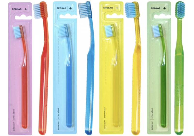 Zubní kartáček pro dospělé SPOKAR PLUS je dostupný ve čtyřech veselých barvách. Tělo zubního kartáčku je vyrobeno z průhledného plastu a je zakulacené. Zadní hrana je rovně seříznuta pro pohodlné odkládání, takže se kartáček neskutálí z umyvadla. Pohodlnému čištění napomáhá kromě malé hlavičky také zúžený a prohnutý krk kartáčku.