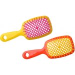 Určen pro snadné a šetrné rozčesávání suchých i vlhkých vlasů. Je vybaven plastovými hroty dvou délek: krátké štětiny uhlazují vlasy a dodávají jim lesk, zatímco dlouhé štětiny jemně rozčesávají zacuchané prameny. Kartáč je vhodný pro všechny typy vlasů, včetně vlnitých, dlouhých nebo hustých, a minimalizuje tahání a poškození vlasů. Jeho ergonomický design zajišťuje pohodlné použití a je ideální pro domácí i profesionální péči.