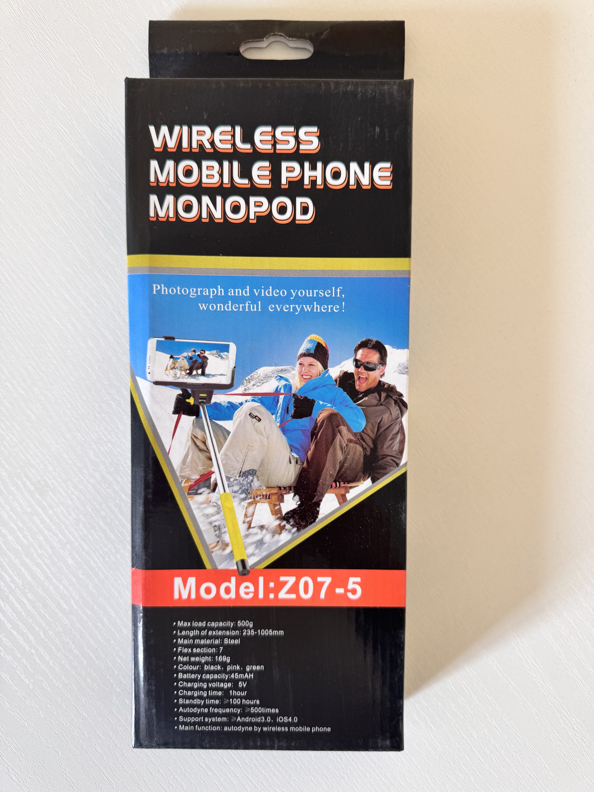 – balení obsahuje selfie tyč s tlačítkem, český návod, kabel pro dobíjení přes USB, krabice